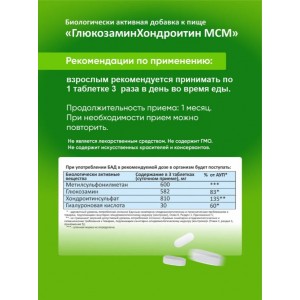 «МSМ» в таблетках является универсальным источником основных компонентов хрящевой ткани, включает в себя активные хондропротекторы и восполняет необходимый объем гиалуроновой кислоты, восстанавливает вязкость и эластичность внутрисуставной жидкости, защищает суставы от преждевременного изнашивания и разрушения, способствует восстановлению их функций, снижению воспалительных процессов и улучшению суставной и тканевой микроциркуляции. Благодаря активным компонентам уменьшается трение в суставах и увеличивается их подвижность, что помогает чувствовать комфорт при движении и продлевает суставам жизнь. Это, особенно, важно для людей старшего возраста, у которых соединительная ткань теряет механическую прочность. Таблетки ффективно и направленно воздействует на причину заболевания. Растительная формула комплекса включающая природные целебные травы работает по следующим направлениям: уменьшает боль и воспаление, укрепляет и питает хрящевую ткань, улучшает подвижность сустава, замедляет разрушение сустава. Пищевая добавка в виде капсул для укрепления и поддержки здоровья суставов, связок и хрящей. Этот комплексный мультивитаминный продукт содержит все необходимые вещества для поддержания оптимального состояния коллагена в организме. В состав входят глюкозамин, хондроитин, гиалуроновая кислота и МСМ. Данный предмет питания может быть полезен как мужчинам, так и женщинам разных возрастов – от подростков до взрослых. Он способствует уменьшению боли в суставах и облегчению движения, является эффективным обезболивающим средством. Кроме того, это дополнение позволяет укрепить ногти, волосы и кожу за счет содержащихся в нем элементов.
