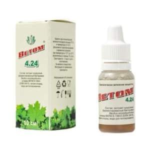 Ветом 4.24 представляют собой жидкую питательную среду после выращивания бактерий Bacillus amyloliquefaciens штамм ВКПМ В-10643 (DSM 24615).  По внешнему виду препараты представляют собой жидкость светло-коричневого цвета с характерным амиачным запахом. Возможно наличие нерастворимого осадка. Оздоровительный эффект обеспечивается свойствами бактерий Bacillus amyloliquefaciens, которые, размножаясь преимущественно втонком отделе кишечнике,Биологически активное вещество  Ветом 4.24 применяется в качестве дополнительного источника пробиотических микроорганизмов для оздоровления организма человека.